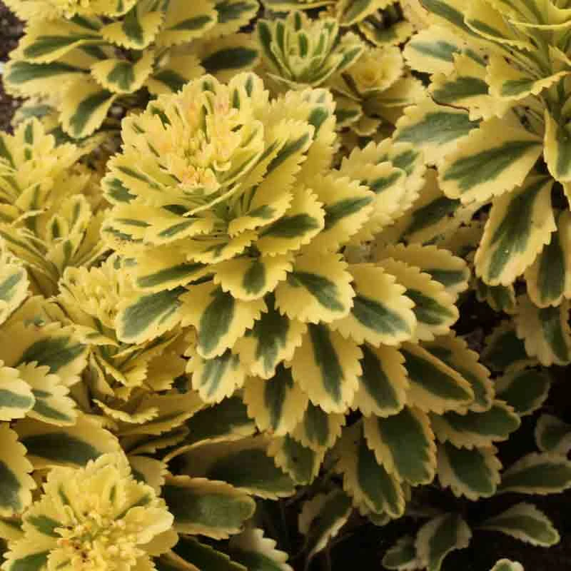 - Green rosettes with wide cream-yellow edges look great in containers.