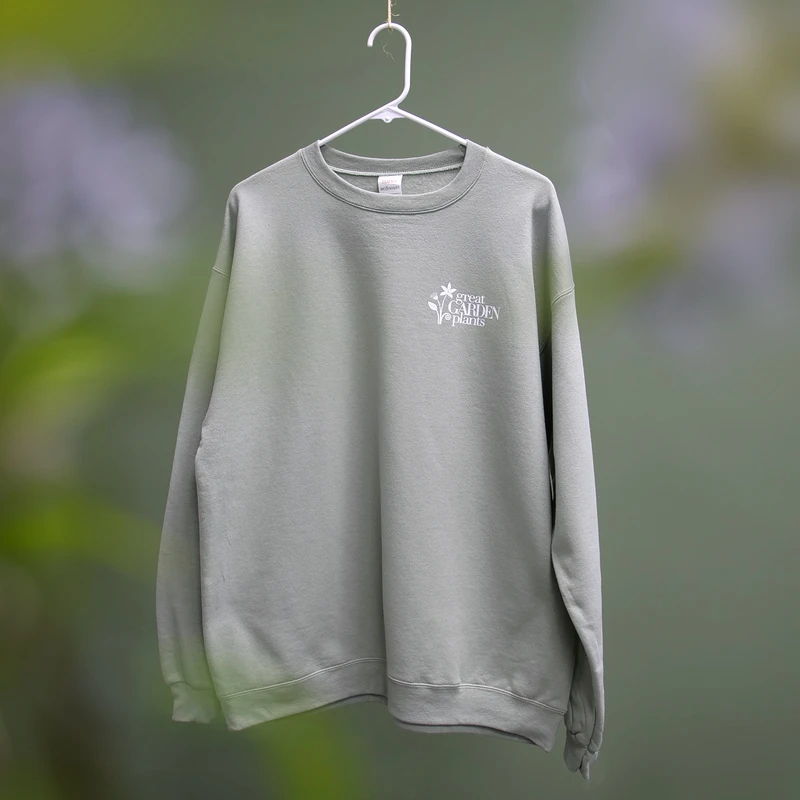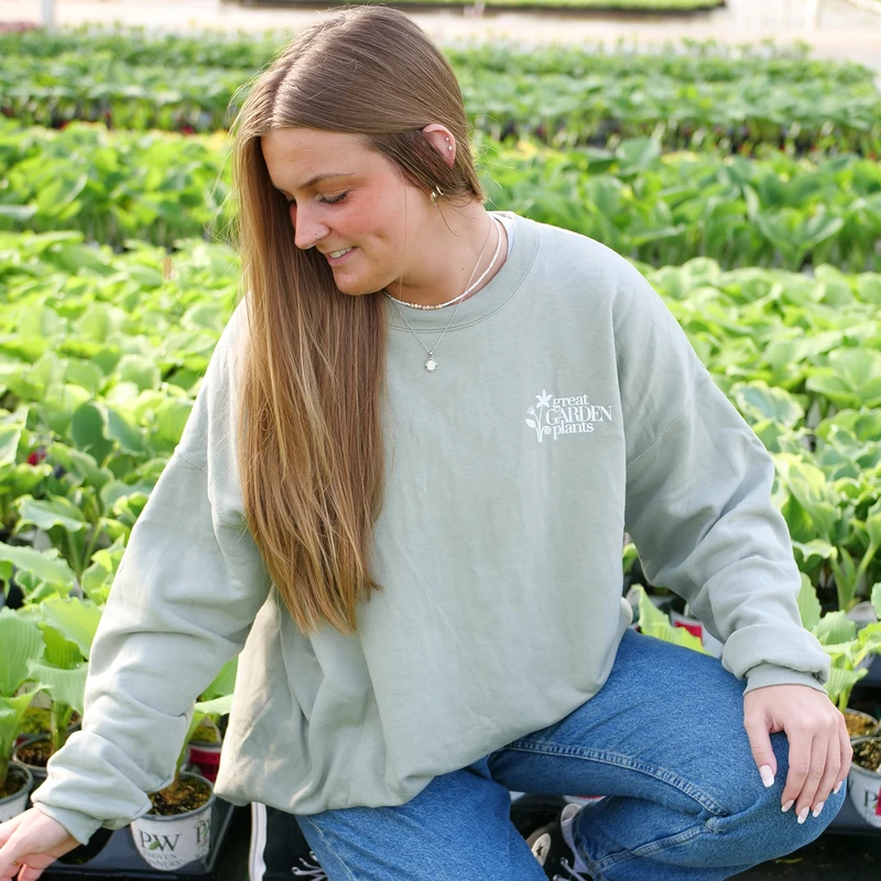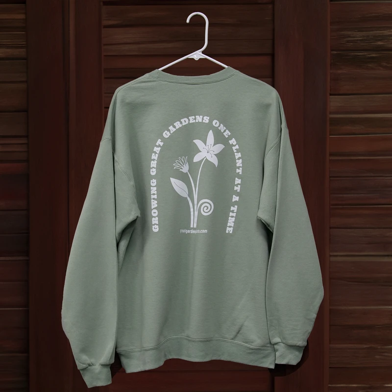Calling all gardeners: our new ‘Growing Great Gardens’ unisex sweatshirt is the perfect addition to your closet! The beautiful stonewash green color can accompany the sea of green foliage from your garden plants and looks fantastic paired with overalls, jeans, or leggings. This sweatshirt also features a rib-knit waistband and cups to help keep you warm and cozy on chilly days while you reminisce and look forward to returning to the garden. What’s not to love? Add to the cart!